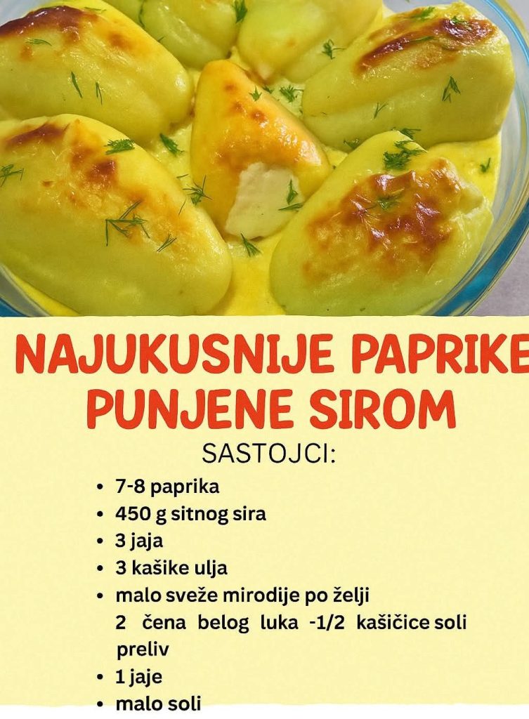 Sastojci: 7-8 paprika (650g) 450 g sitnog sira 3 jaja 3 kašike ulja malo...
