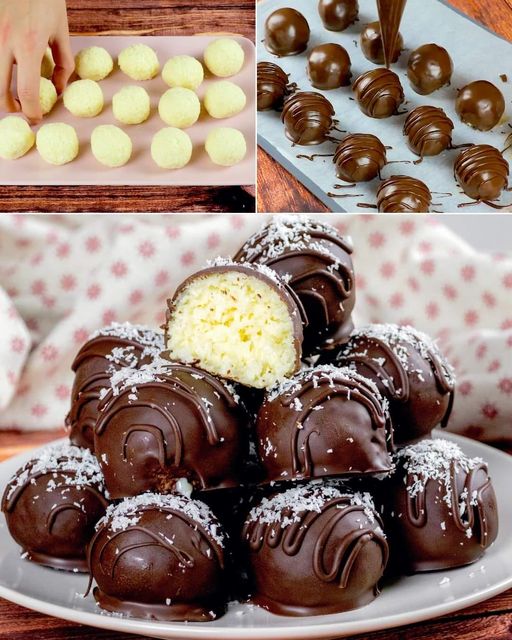 Žličicom umočite kokosove kuglice u otopljenu čokoladu.