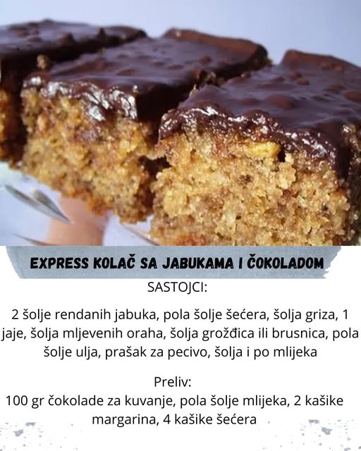 Rerna prethodno treba da bude zagrijana. Kolač ohladiti. Napraviti čokoladnu glazuru tj. preliv od gore navedenih sastojaka te ga sa njom ukrasiti.Kolač je jako sočan, ne koristi se brašno jer je tu griz kao zamjena po meni mnogo bolja varijanta.
