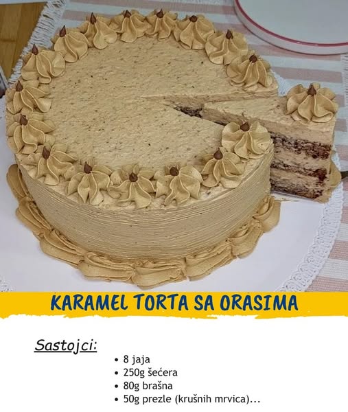 Za fil, na laganoj vatri karamelizovati šećer do zlatno smeđe boje, pa pažljivo dodati mlijeko (paziti jer će prskati). Miješati dok se karamel ne otopi. Posebno razmutiti gustin u malo mlijeka, zatim dodati u karamelizirano mlijeko i kuhati dok se ne zgusne. Ohladiti pa dodati umućeni maslac i mljevene orahe, te dobro sjediniti u glatku kremu.