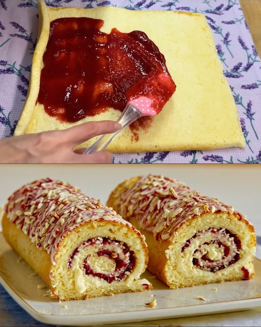 9. **Navlaženje i fil:** Pažljivo odmotajte ohlađeni biskvit, premažite mlijekom, rasporedite kremu od jagoda, ostavljajući 1 cm rub. Ponovo motajte u čvrst spiralni rol.