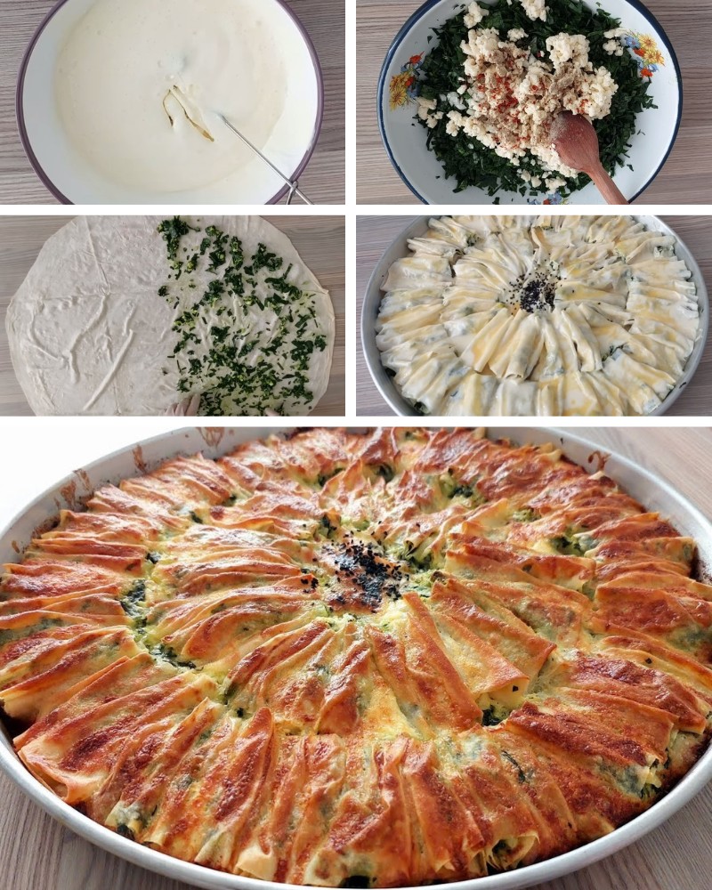 Za nadjev, nasjeckajte listove špinata i iscijedite vodu. Dodajte sitno nasjeckani luk, sir i začine te promiješajte.