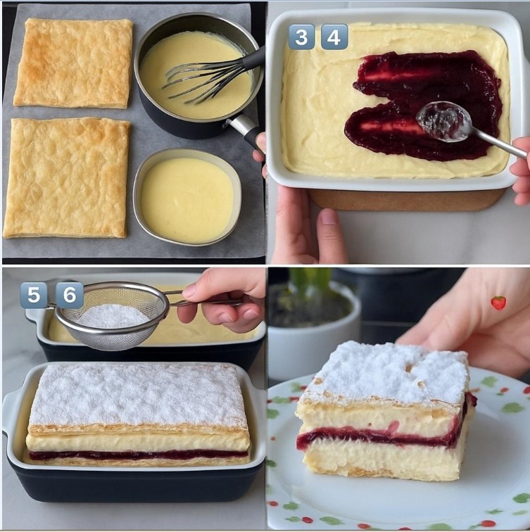 4. Preko voća stavite ostatak vanila kreme i drugi list lisnatog tijesta na vrh.
