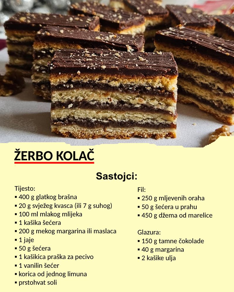 Žerbo kolač je tradicionalni, bogati kolač u slojevima, koji potječe iz Mađarske. Sastoji se od prhkog tijesta, nadjeva od mljevenih oraha i džema od marelica, a sve je preliveno čokoladnom glazurom. Spoj orašaste arome, voćne slatkoće i čokolade čini ga nezaobilaznim blagdanskim desertom.